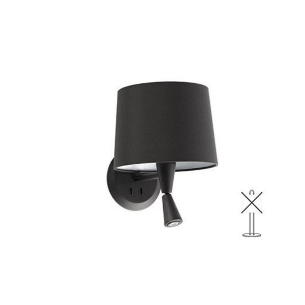 Lámpara de aplique negra de interior diseñada por Faro Lab. Es la reinvención de las clásicas series para hoteles y hogares. Todas las estructuras se pueden combinar con distintas pantallas para adaptarlas a diferentes gustos y necesidades. Este aplique con lector Led de color negro es ideal como luz de apoyo o lectura.