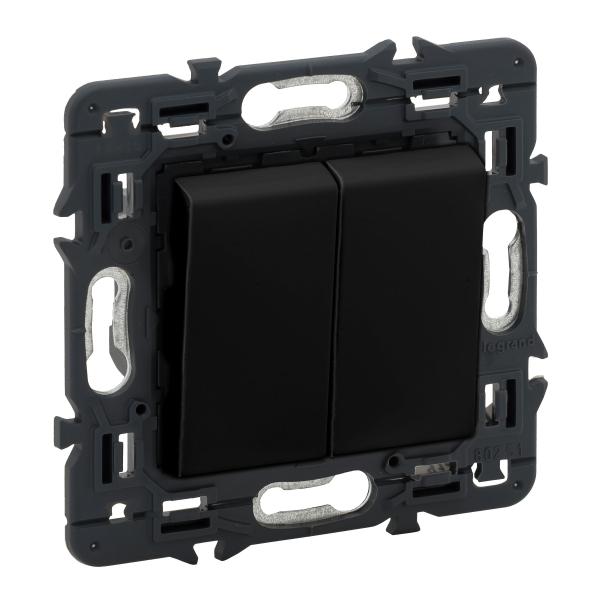Interruptor doble unipolar 10 AX - 230V~ - Bornes automáticos - Dark.Embornamiento automático que garantiza una conexión rápida y sin herramientas10AX, 250VEsquema y marcado claro de los mecanismos para una identificación fácil y un cableado seguro.Se suministra con bastidor bimaterialll compatible con separaciones de 71 mm y 57 mm.