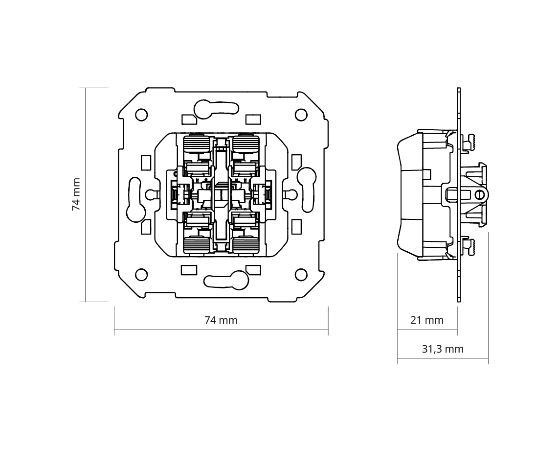 El Grupo de dos pulsadores con intensidad de 10 AX y voltaje de 250V~ que incluye dos entradas y dos salidas responde a las exigencias del mercado. Es apto para mecanismos de persianas sin sistema de enclavamiento con embornamiento rápido. Estamos ante un mecanismo válido para los productos incluidos en las series Simon 75 y 82.Para su instalación es necesario el uso de una caja universal de empotrar, o en su defecto un zócalo de superficie y requiere dispositivo de control. Diseñado para soportar condiciones de ambiente extremas gracias a los componentes metálicos con aislamiento termoplástico libre de halógenos con los que ha sido fabricado. Sus características técnicas se completan con una sección de cable de 1,5 a 2,5 mm y un pelado de cable de 11 mm. Máxima calidad al mejor precio.