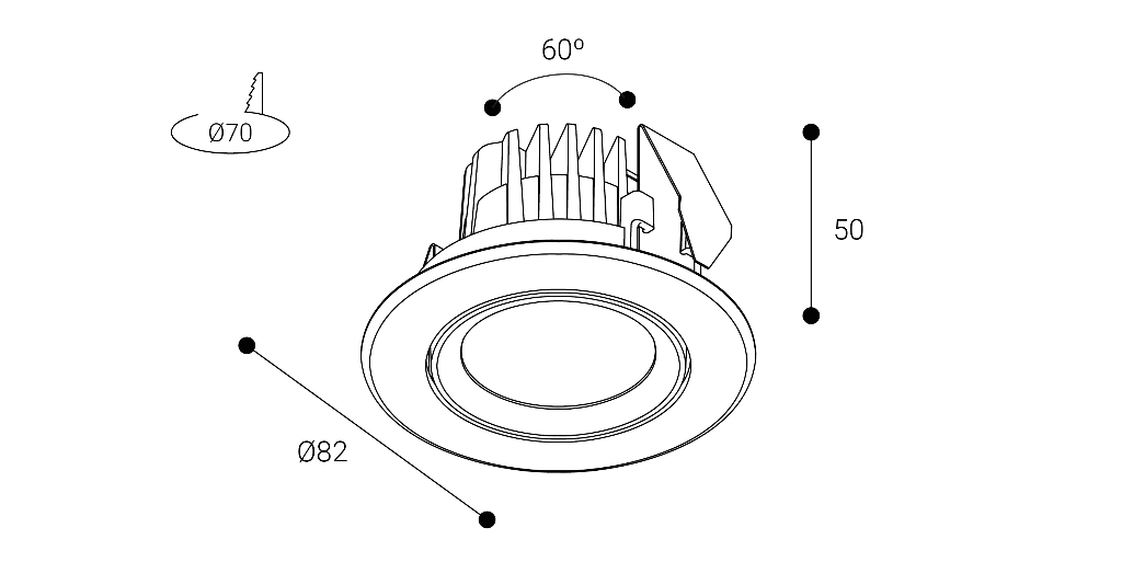 Tiny ref. TI03DB, fabricado por Normalit. Flujo: 670lm. CRI: 80%. Temperatura de color: 3000K. Ángulo de apertura: 66º. Versión: DALI2. Modo de instalación: Empotrada techo directa. Eficiencia: 87,3%. Expectativa de vida: 60.000h L70B10. Elipses de MacAdam: 3. Seguridad fotobiológica Grupo: 1. UGR: 19. Alimentación: 220-240V 50/60Hz. Potencia: 5,8W. Consumo: 7W. Factor de potencia: 0,94. Clase: II. IP: 20. Hilo incandescente: 850ºC. Descripción de materiales: Disipador: Aluminio inyectado. Reflector: Policarbonato. Aro: Policarbonato. Acabado: Blanco, diámetro: 82mm. Peso: 0,14kg. Temperatura de trabajo: de -20ºC a 40ºC