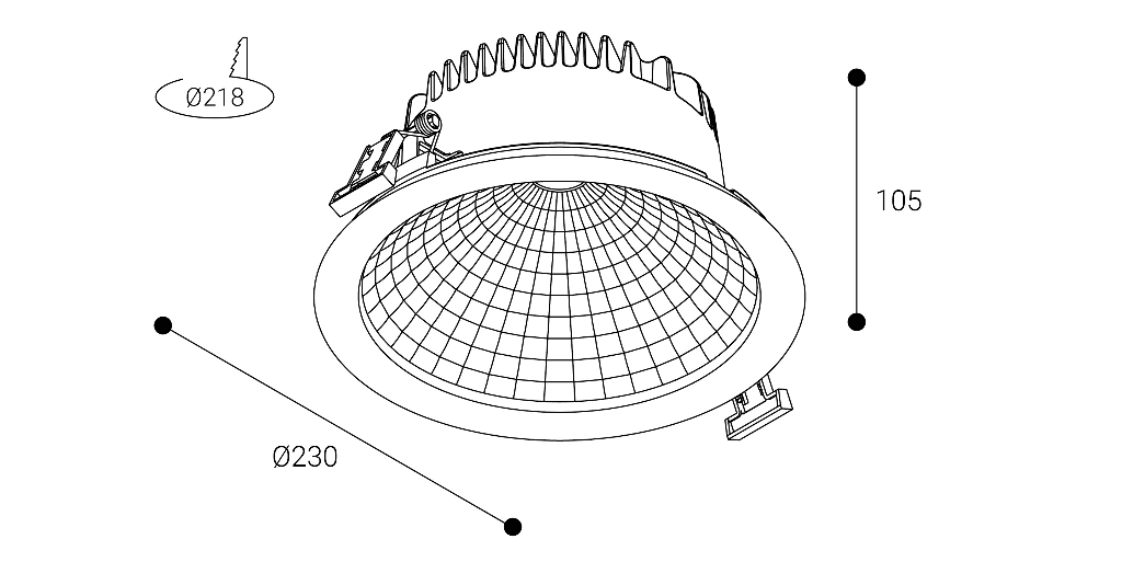 Elit ref. EL43G, fabricado por Normalit. Flujo: 3580lm. CRI: 80%. Temperatura de color: 3000K. Ángulo de apertura: 99º. Versión: Estándar. Modo de instalación: Empotrada techo directa. Eficiencia: 95,4%. Expectativa de vida: 60.000h L70B10. Elipses de MacAdam: 3. Seguridad fotobiológica Grupo: 1. UGR: 19. Alimentación: 220-240V 50/60Hz. Potencia: 25,1W. Consumo: 29W. Factor de potencia: 0,95. Clase: II. IP: 20. Hilo incandescente: 850ºC. Descripción de materiales: Disipador: Aluminio inyectado. Difusor: Sin difusor. Reflector: Policarbonato de alta reflexión. Aro: Aluminio inyectado. Acabado: Gris, diámetro: 230mm. Peso: 0,8kg. Temperatura de trabajo: de -20ºC a 40ºC