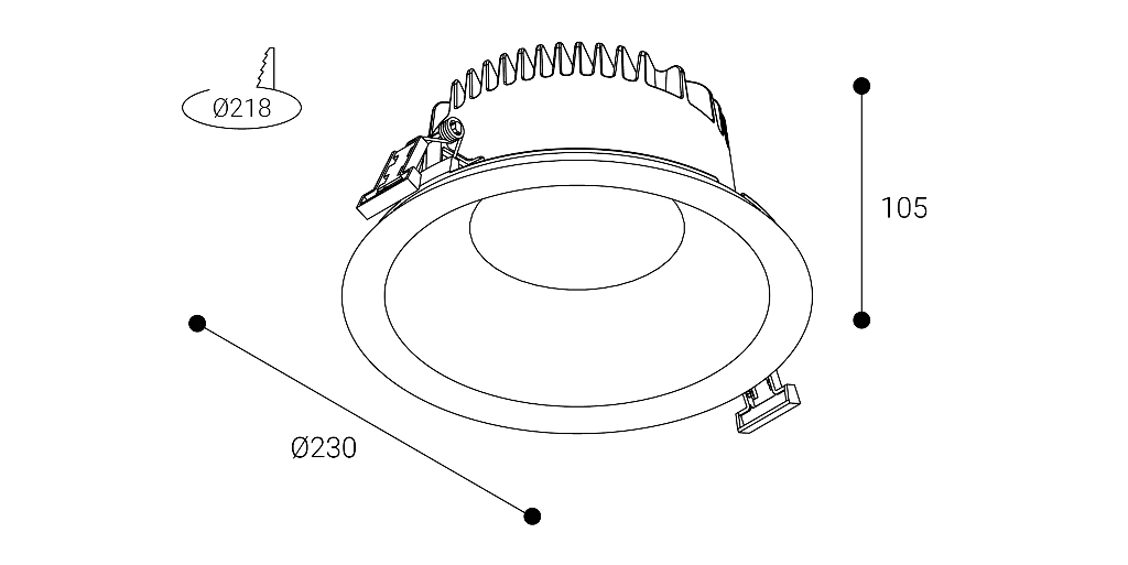 Elit HR ref. ELI34DTB, fabricado por Normalit. Flujo: 2850lm. CRI: 80%. Temperatura de color: 4000K. Ángulo de apertura: 96º. Versión: DALI2. Modo de instalación: Empotrada techo directa. Eficiencia: 92,3%. Expectativa de vida: 60.000h L70B10. Elipses de MacAdam: 3. Seguridad fotobiológica Grupo: 1. UGR: 19. Alimentación: 220-240V 50/60Hz. Potencia: 17,4W. Consumo: 20W. Factor de potencia: 0,95. Clase: II. IP: 20-54. IK: 07. Hilo incandescente: 850ºC. Descripción de materiales: Disipador: Aluminio inyectado. Difusor: Cristal transparente. Reflector: Policarbonato de alta reflexión. Aro: Aluminio inyectado. Acabado: Blanco, diámetro: 230mm. Peso: 1kg. Temperatura de trabajo: de -20ºC a 40ºC