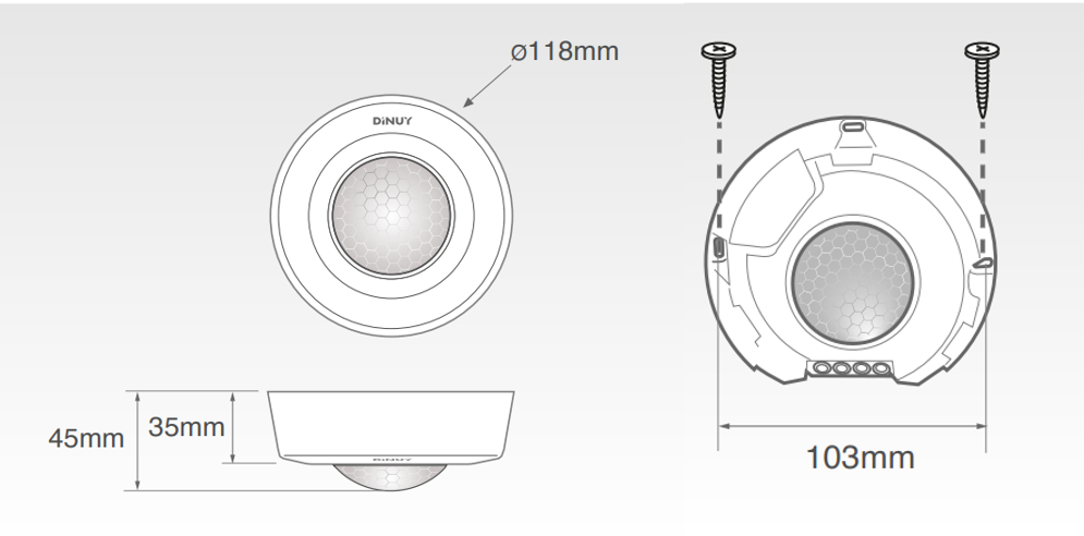 Detector "3 en 1" de interior, para montaje superficial en techo con los siguientes modos de funcionamiento: Detector de movimiento, Detector de presencia, Interruptor crepuscular Dispone de un canal de conmutación con relé de 16A. ZCT (Zero Crossing Technology), conmutación en "el paso por cero", que permite el control de grandes cargas sin dañar su relé. Sensor PIR de gran sensibilidad, el cual detecta el más pequeño movimiento dentro de su área de cobertura. Posibilidad de conectar varios detectores en paralelo para ampliar la zona de detección. Incorpora un indicador LED rojo que ayuda a testear la correcta detección de movimiento del aparato. Incorpora un indicador LED azul para identificar que el detector tiene el Bluetooth activado. Configuración y ajuste mediante App DINUY CONFIGURE.