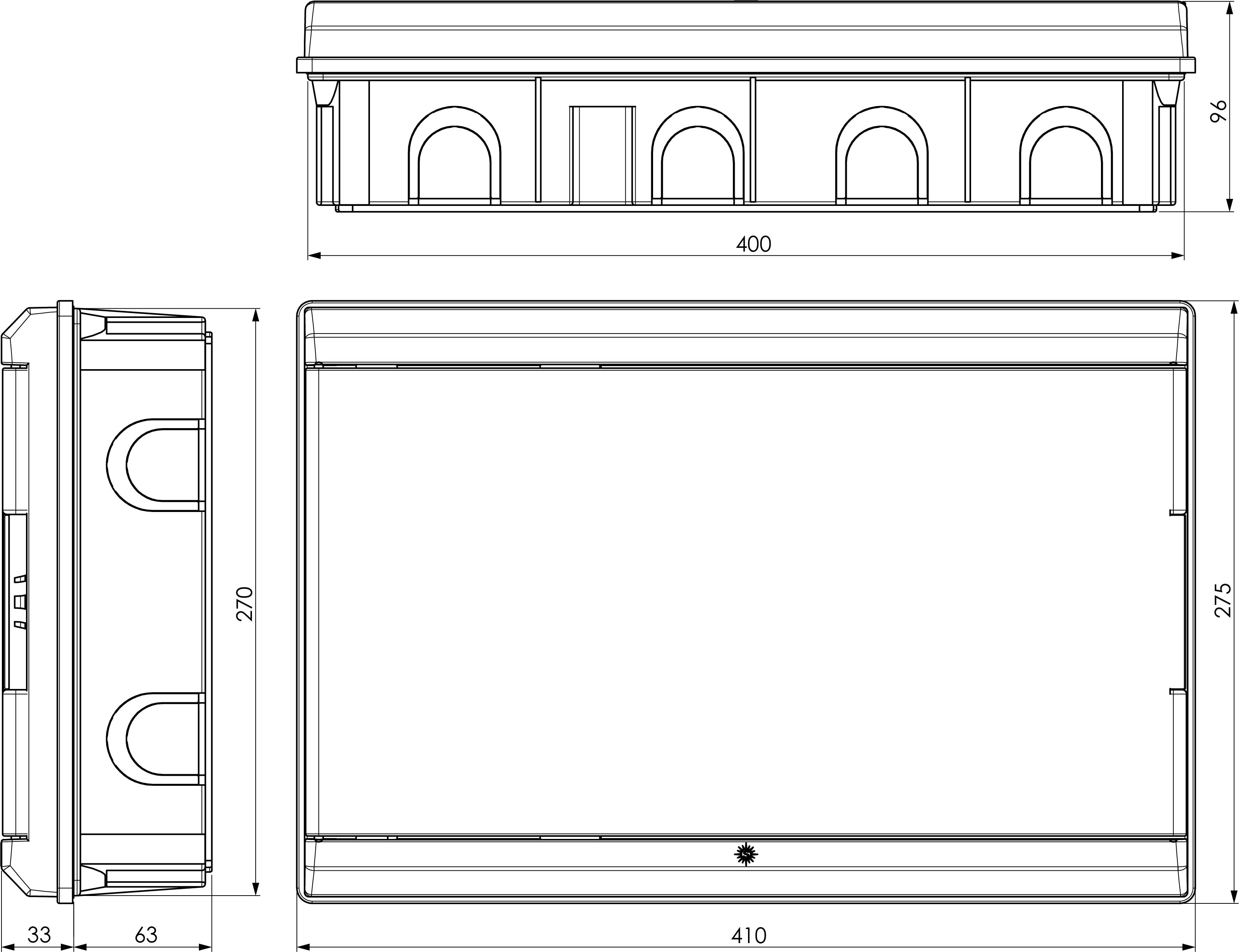 Caja de distribución de empotrar de 24 elementos + 4 precintables.2 filas. Tapa, marco y puerta color blanco. Dimensiones 400 x 270 x 63 + 33 mm de profundidad del marco.