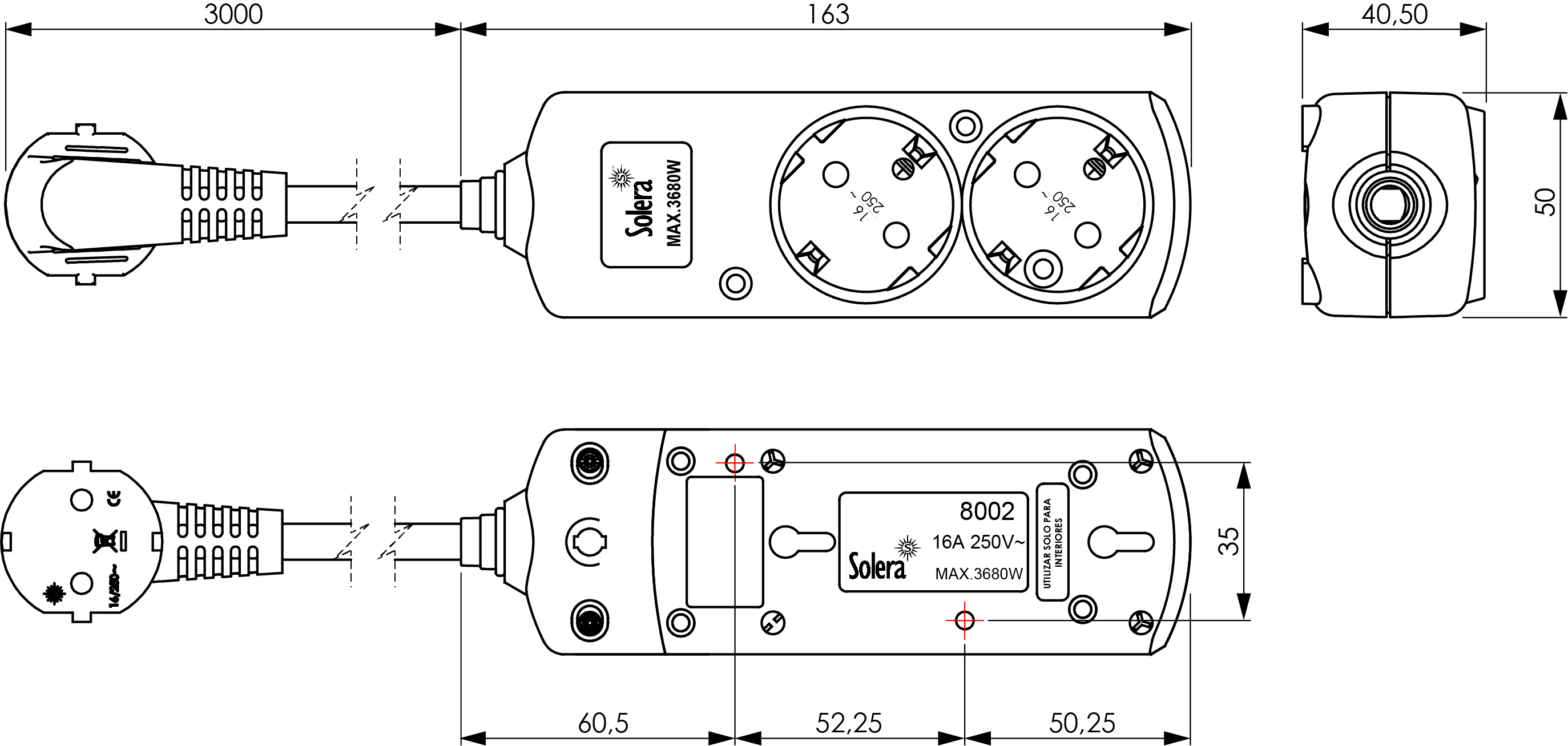 Base de 2 tomas bipolares con T/T lateral 16A 250V~. Longitud 3 m. Bases múltiples CON cable. Certificado INTERTEK / GS.