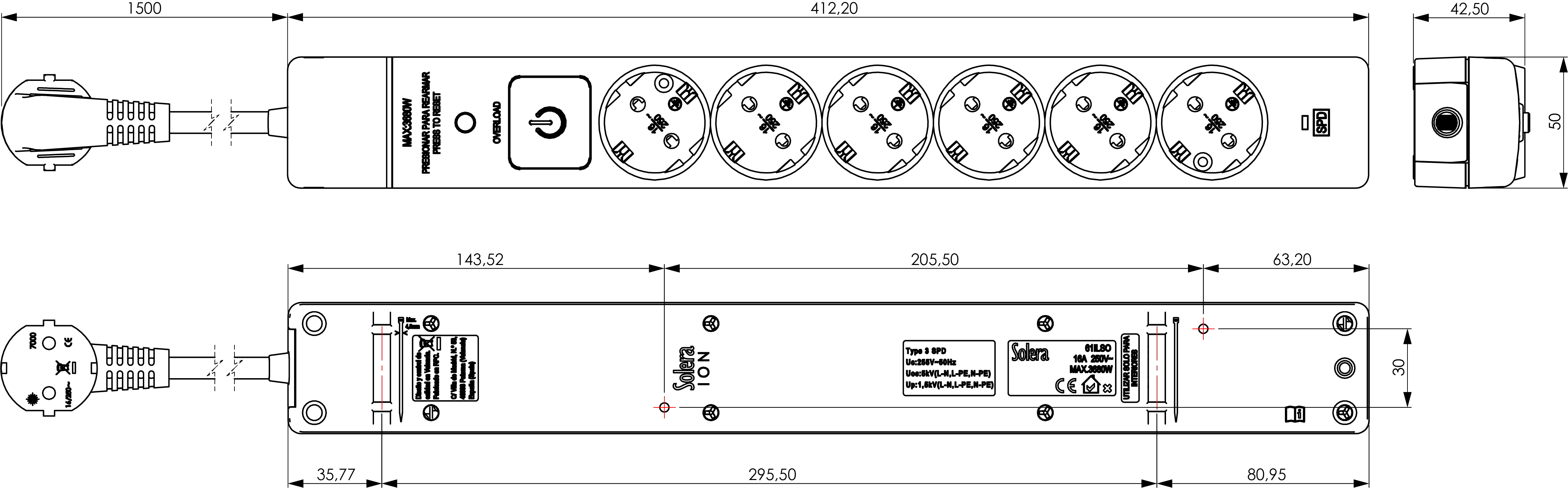 Prolongador con 6 tomas 2P+T, 16A 250V~. MÁX.3680W. 850°C GWT. Con interruptor luminoso. 1,5 m de cable H05VV-F 3G1,mm² .Color blanco. Con agujeros para fijación por tornillos a la pared y orificios para fijación mediante bridas a tubos. Con protección para sobretensiónes y sobrecarga. Fabricado en Policarbonato. Serie ION.