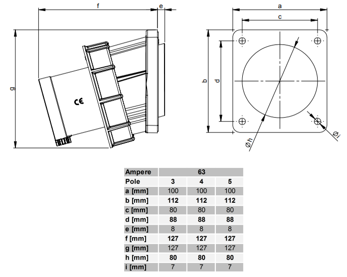 Clavija trascuadro con calificación IP67 en la escala de protección contra agentes externos. Este producto cuenta, además, con tres polos más neutro y tierra, y unos valores de corriente y tensión nominales de 63A y 400V.